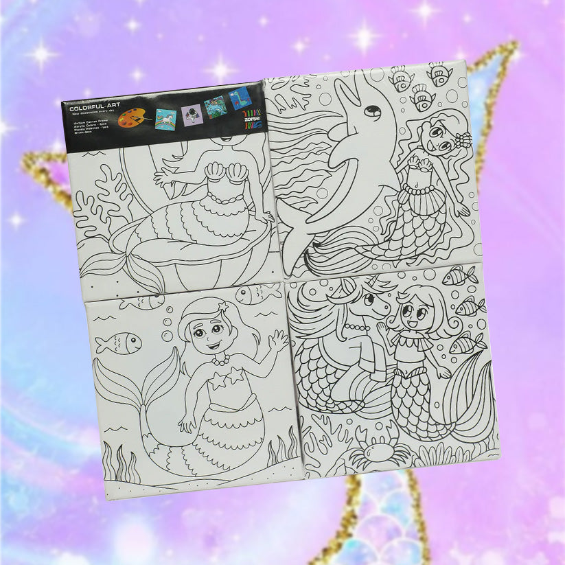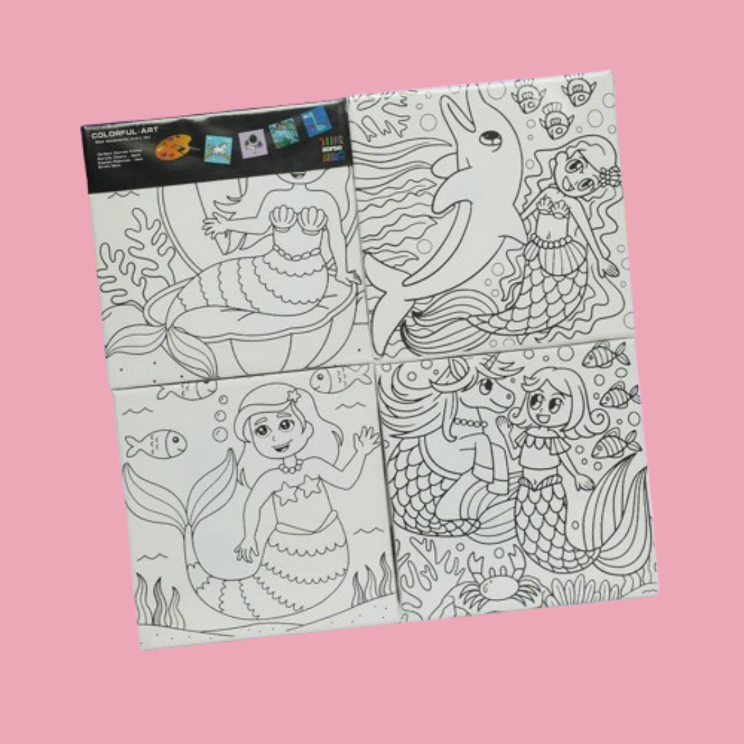 Add a touch of whimsy to your home with the ZORSE Mermaid 4pc canvas painting set. Each 15 x 15cm wooden frame features eight expressive shades of mermaids, adding quirky charm to any room. Let these unique and colorful pieces bring a smile to your face (and your walls)!