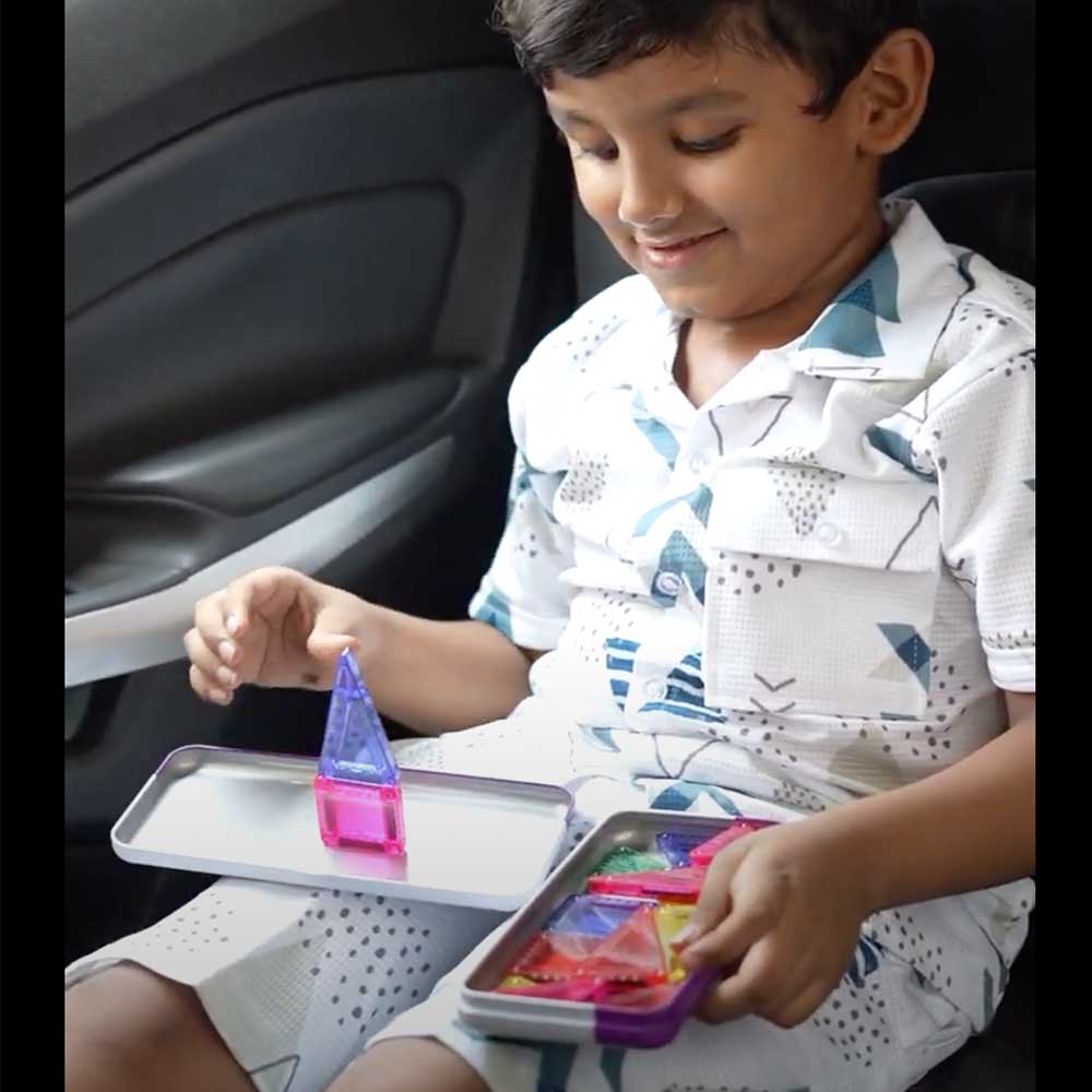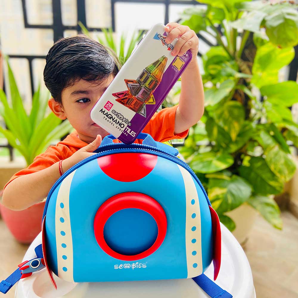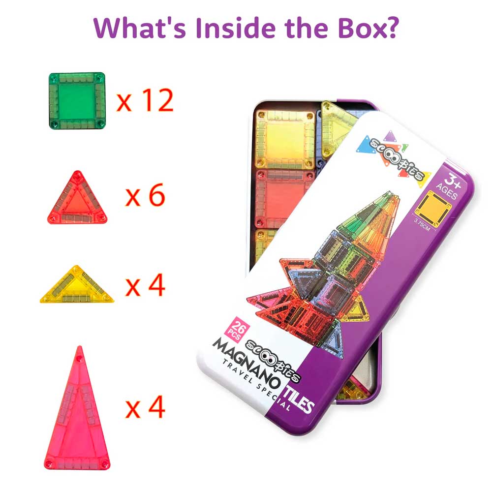 Scoobies Magnano Tiles Travel Special! This 26-piece compact magnetic tile set is perfect for kids aged 3+, encouraging STEM learning and imaginative play anytime, anywhere. Lightweight, durable, and portable, it's ideal for travel and family fun.