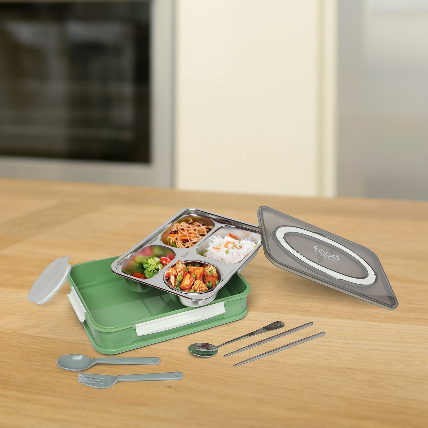 Maximize your lunch options with our durable, stainless steel 4 compartment lunchbox. With a generous 1000 ml capacity, you can pack a variety of food for a healthy and convenient meal on-the-go. Keep your food separated and fresh in our green lunchbox, perfect for busy days.