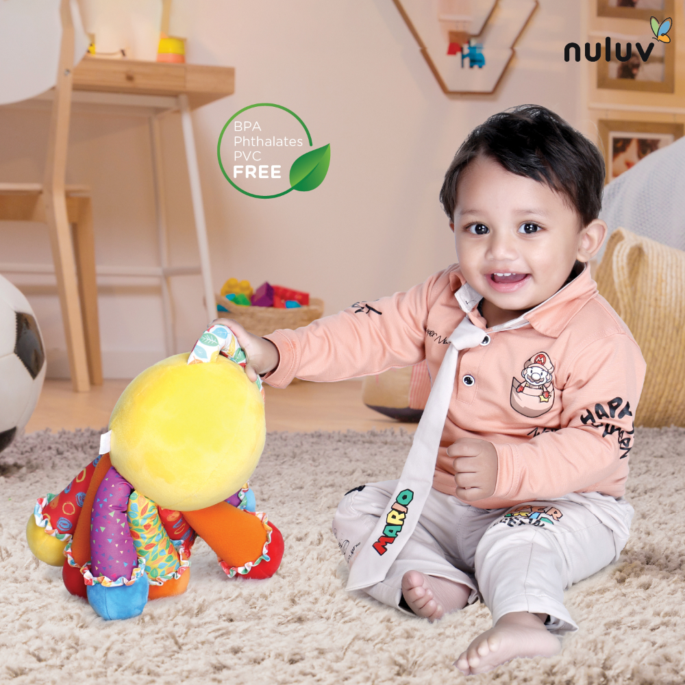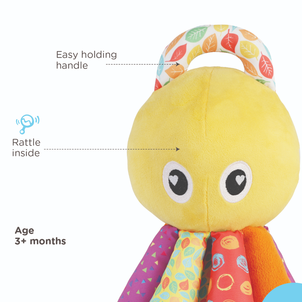 The vibrant Activity Octopus is a delightful addition to your babyβs toy collection. With a cute face and eight colourful tentacles, this cute little pet is sure to entertain your baby and help learn age appropriate skills.