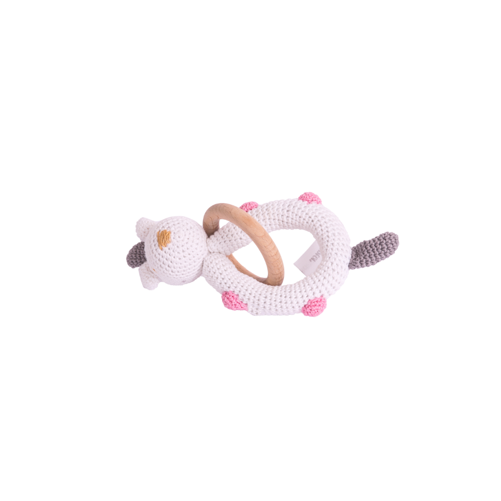 Baa Baa White Sheep is a crochet rattle which is best for not just distracting a crying baby (a common myth) but also develop the baby's fine motor skills. The baby safe material makes it safe for the baby to grip the toy in its soft and tiny hands. The sound is perfect for the baby's ear, not too much not too slow. It also stimulates the hearing power. The wooden ring works as a teether for the baby when the gums begin to sore, and the baby wants to put everything in its mouth.
