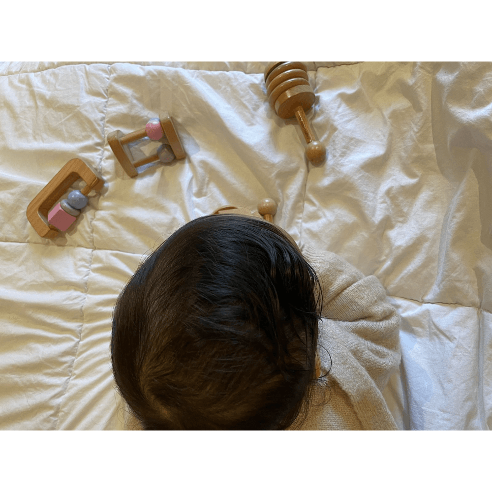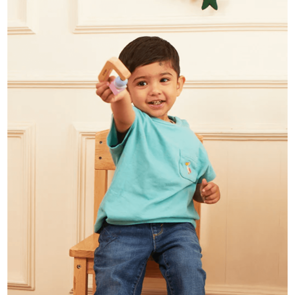The Talking Shapes Rattle is not just a toy for distracting the baby when crying (the popular myth about a rattle), but much more. It provides a real experience for the baby to learn the capacity of their hands and the way they can be used to manipulate the environment around them. The rattle is made up of natural wood, which is in accordance with the Montessori theory of giving infants products made up of natural material and rooted in realism. It provides a sensorial experience to the infant, Develops the touch and feel when it comes in contact with the texture and temperature of the material. The size is appropriate for both the parent and the child to hold it later on. Once the baby begins to hold things, they connect the dots between size and weight. The sound is just right to provide the correct stimulus to the baby, not too less not too much!