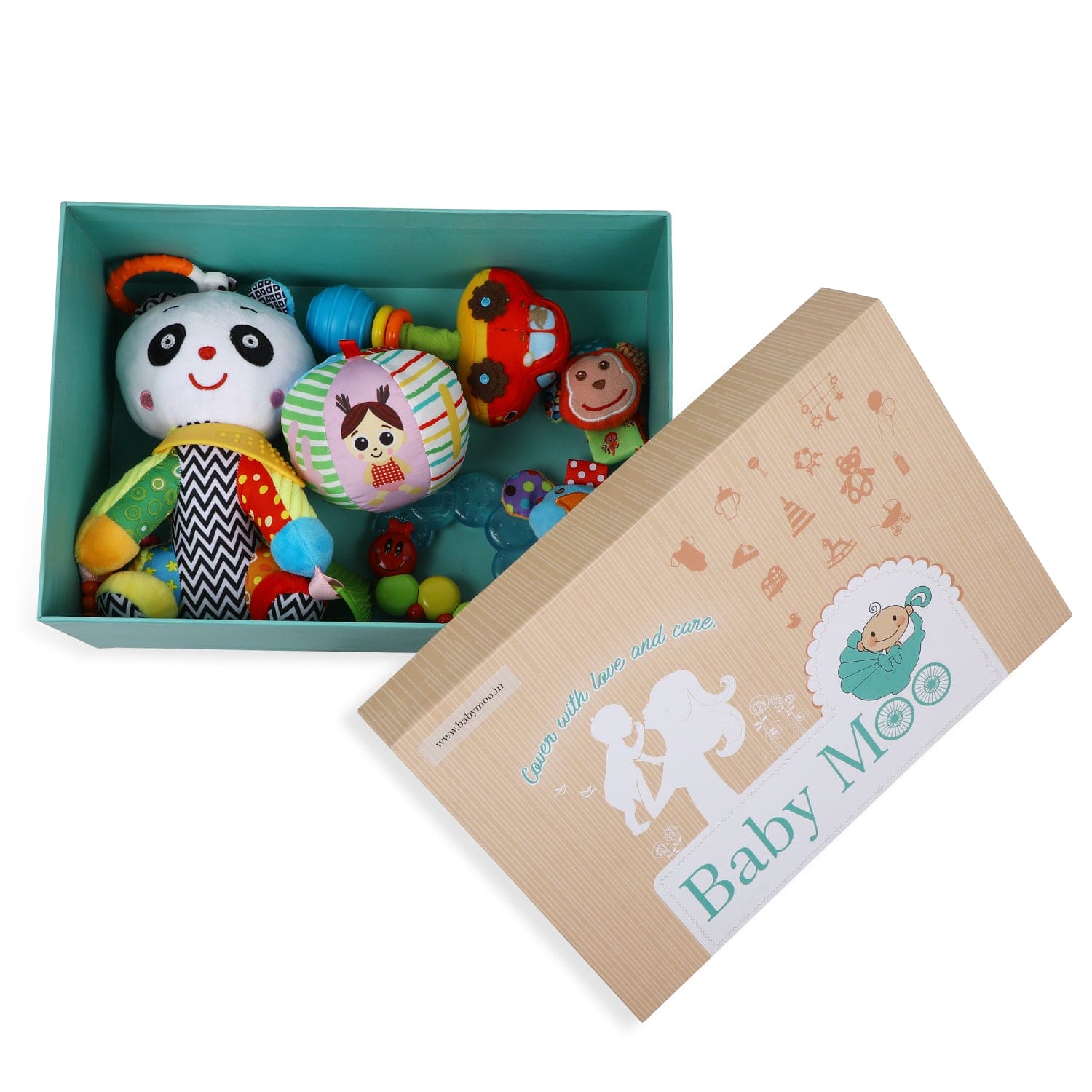 Introduce your little one to a world of wonder with the Baby Moo Newborn Play Kit. Designed to stimulate your baby's senses and aid in their development, this kit includes six essential items curated with care. The high-contrast cards are perfect for newborns, captivating their attention and promoting visual development. The assortment of toy kids rattles online provides auditory stimulation and encourages hand-eye coordination as your baby grasps and shakes them. Crafted with safety and comfort in mind, the teethers soothe teething discomfort and promote healthy oral development. With vibrant colors and engaging textures, these toys are sure to keep your little one entertained and happy. Whether you're at home or on the go, this versatile kit ensures that playtime is always within reach. Give your baby toys online the best start in life with the Baby Moo Newborn Play Kit.