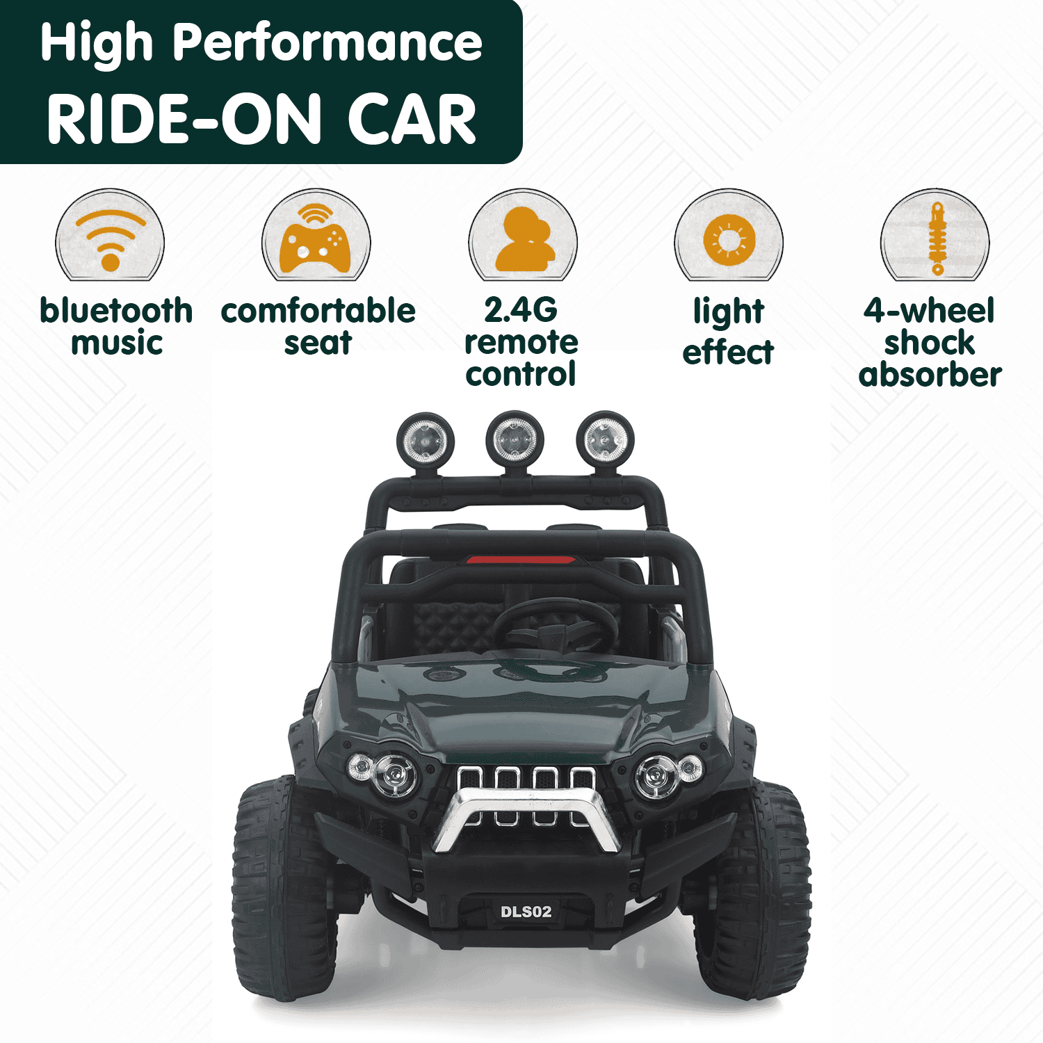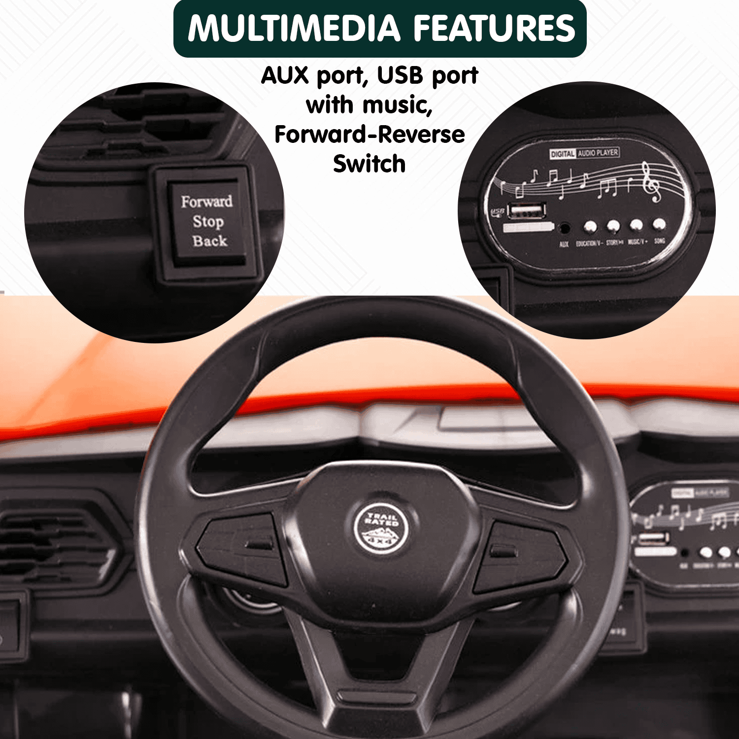 > EASY TO RIDE: forward, backward movement and left and right with handle operated, headlight with electricity display, mp3/usb/tf musics, the 4-wheel designed Cayenney jeep is smooth and simple to ride for your toddler or young children.