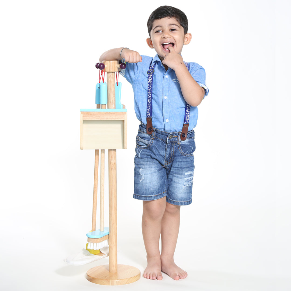 With this set of cleaning instruments, your child will learn to keep the house clean and will love it. It is perfect to inculcate hygeine and cleanliness values in your child. It includes a stand for compact storage.