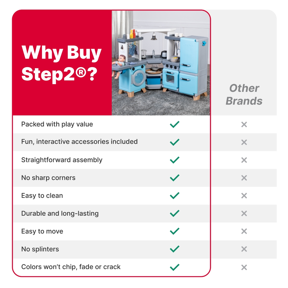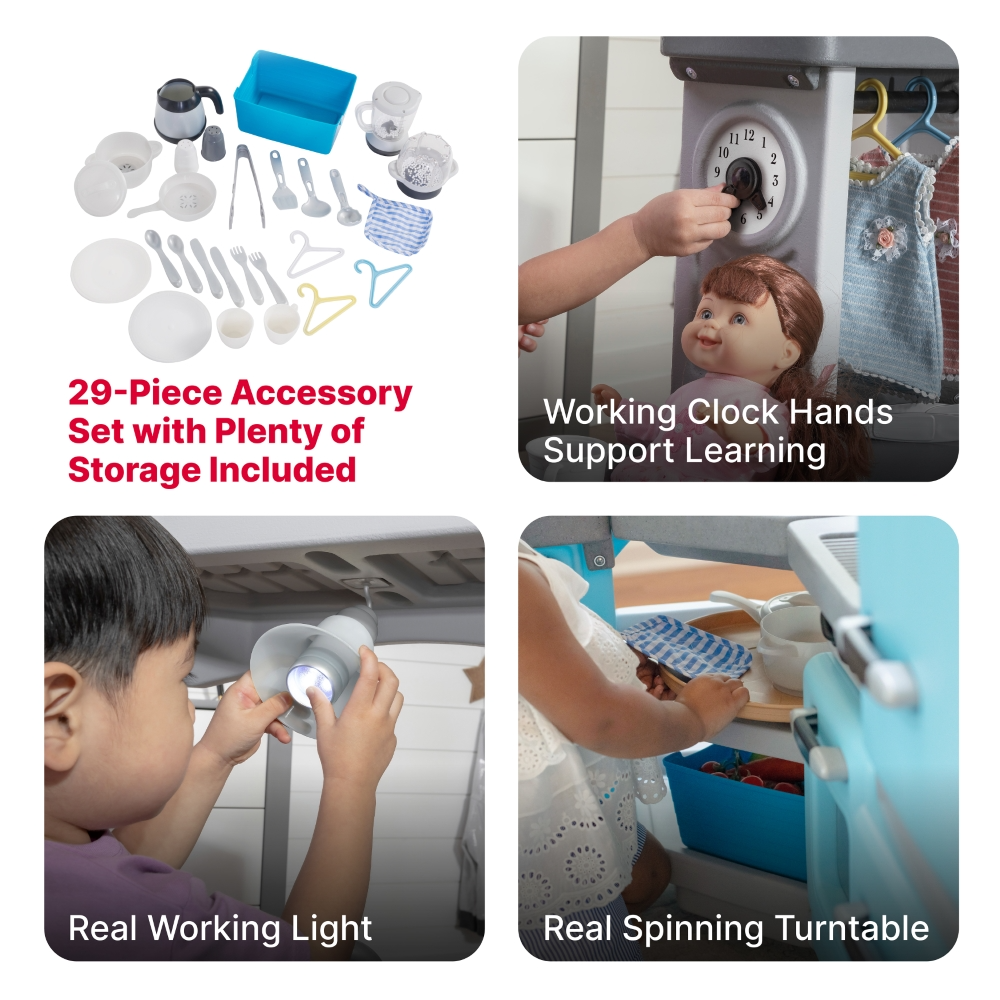 Step into a pretend world full of fun and beautiful design elements with the Cook & Care Corner Kitchen & Nursery™ play kitchen. Little ones can keep pretend kitchen ingredients fresh in the vintage-style fridge or freezer and store gadgets in extra-large bins. Your child can pretend to fire up the stove illuminate the sink with the push-to-activate hanging light and fry boil blend or pop on the pretend burner with electronic lights and sounds that activate automatically when an item is placed on the surface. Little helpers can load the toy washing machine and hang up clothes to dry while baby doll (not included) relaxes in the built-in highchair.