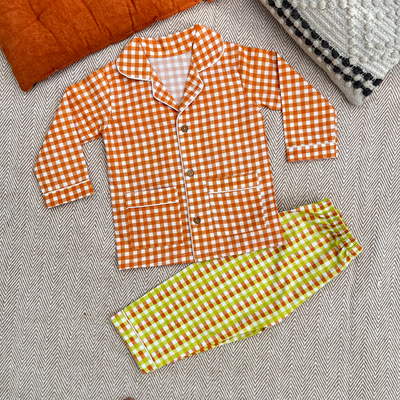 Bhaakur Organic Cotton Orange Checks Night Suit