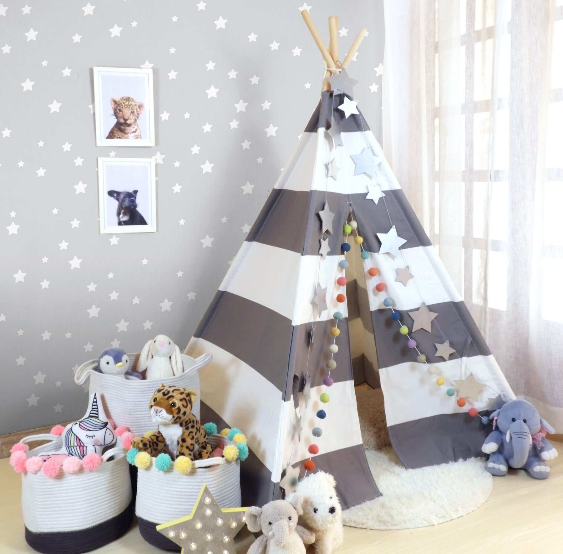- Includes: 1 teepee tent, 8 wooden poles, 4 pole connectors, 4 anti-slip base connectors and 1 anti-slip padded play mat