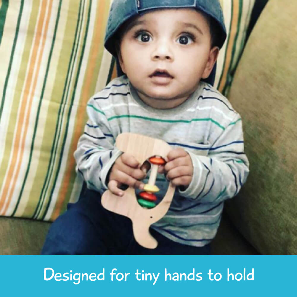 An adorable elephant-shaped Ele needs wooden rattle toy that functions as a rattle, or a teether, encouraging babies to explore multiple textures and colors as they enhance their grasp reflex and fine motor skills.