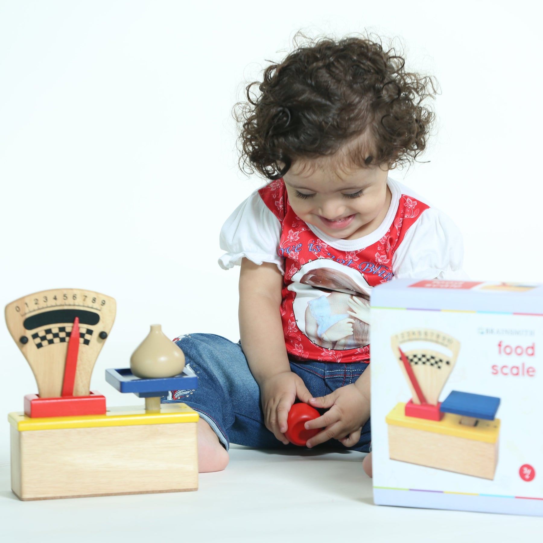 This traditional wooden shop scales with realistic working action and read-off pointer scale will allow children to see cause and effect once they put an item on the scale. They will be able to identify the weight of each item while at the same time develop their mathematical skills.