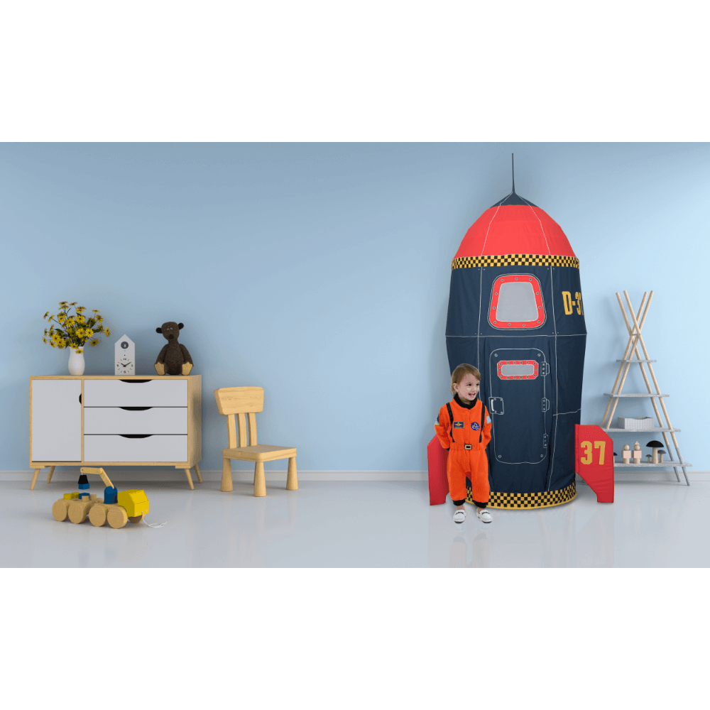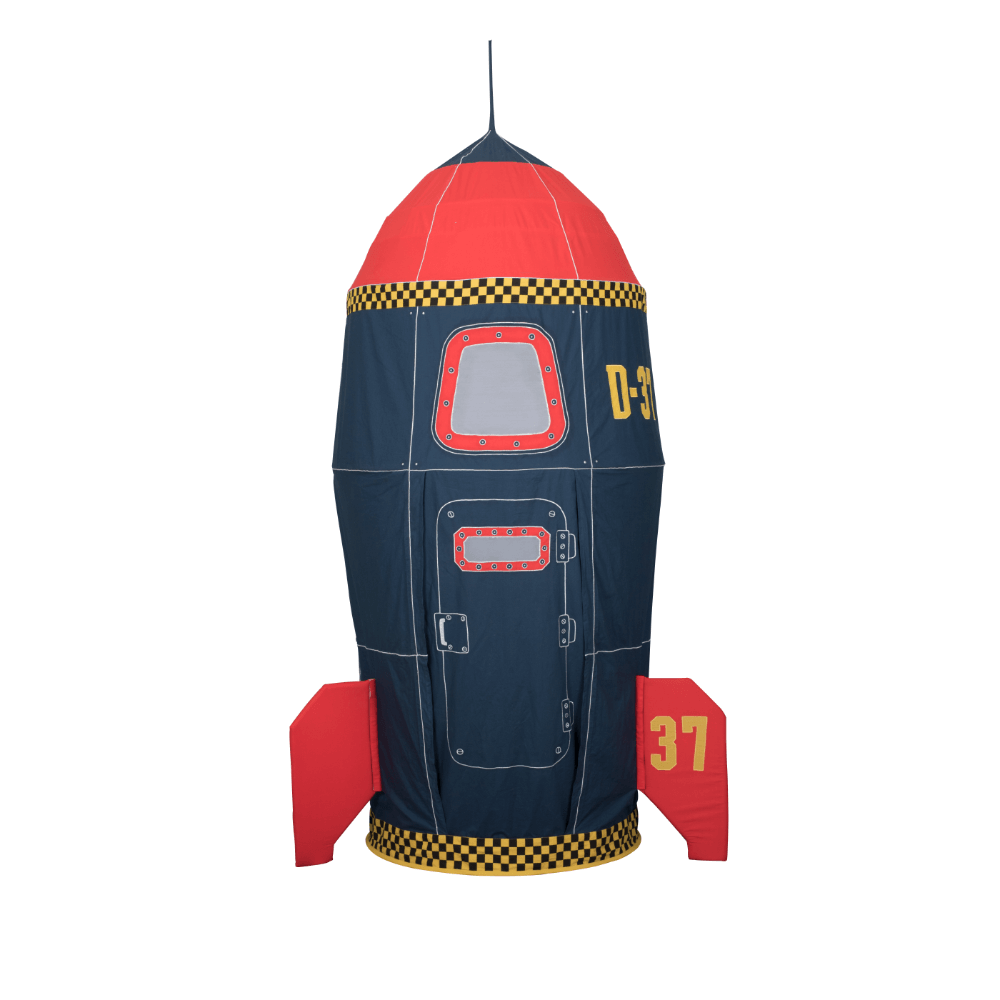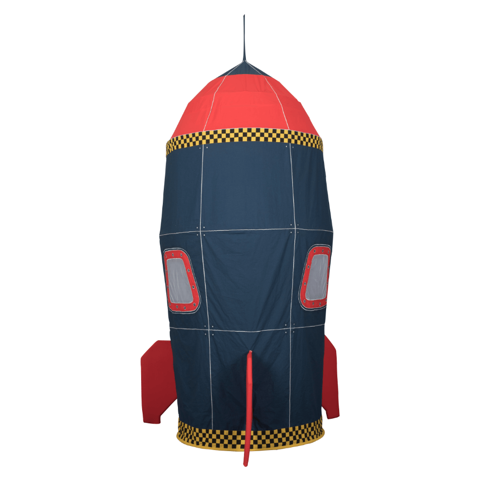 Rocket ship features an illustrated fabric print of rocket with port windows, detachable fins, airlock door, and flexible hoops. Just hang from the ceiling and watch the room transform. Great for pretend play or a little reading nook.
