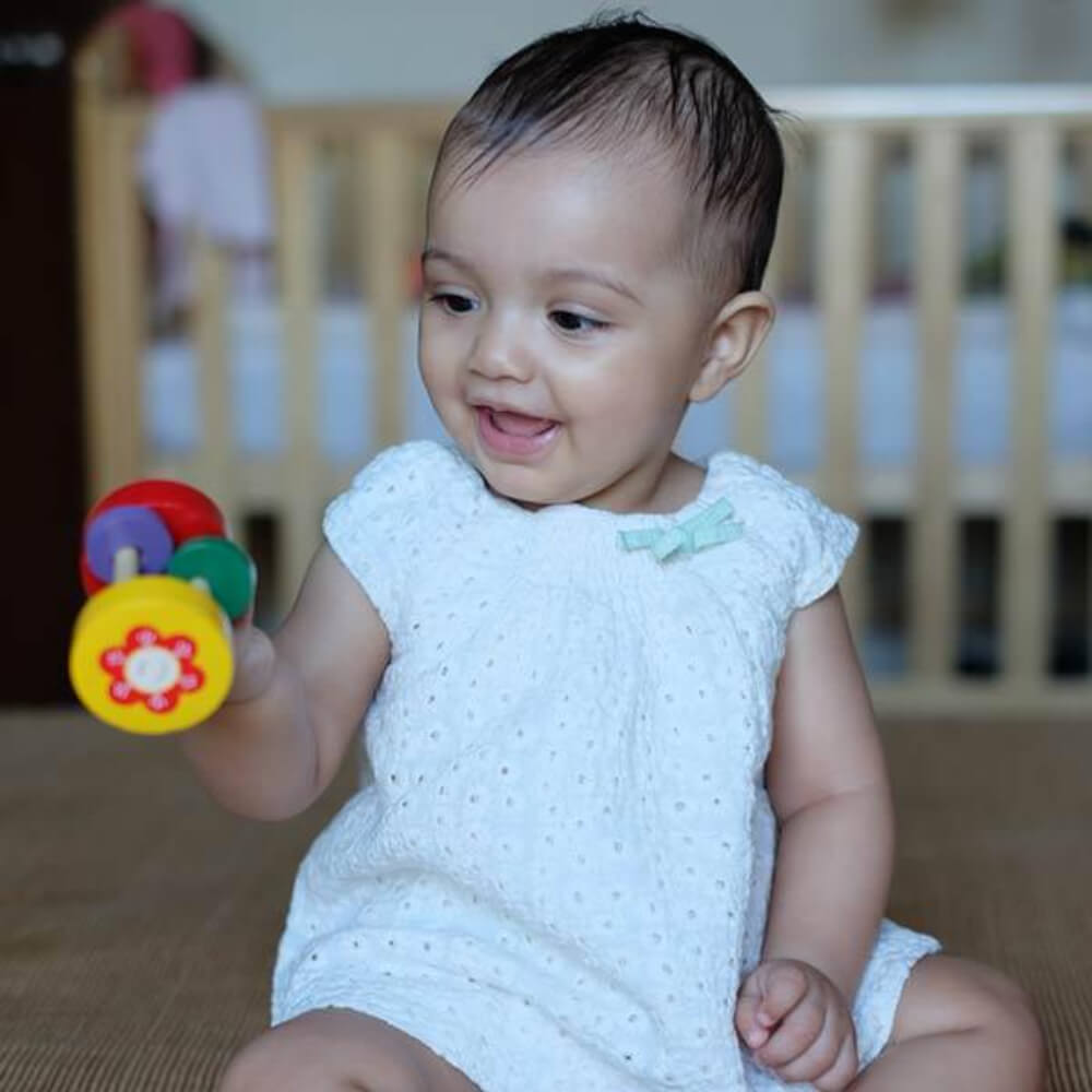 - Place the rattle at a slight distance from your child as an object to reach for and get to as they start crawling.